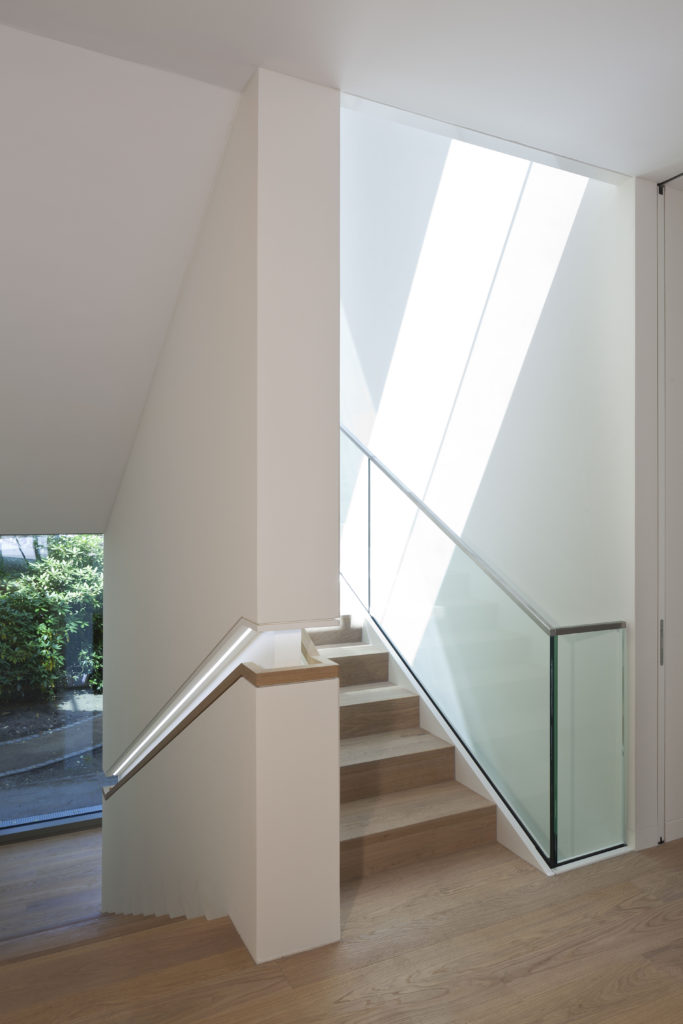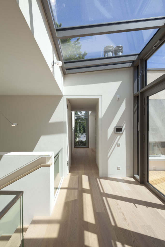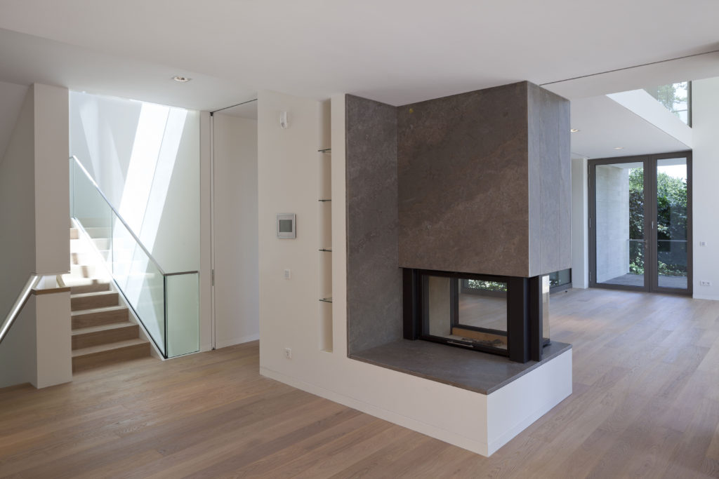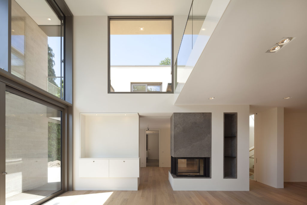 In Hausmitte wird diese Orientierung über die zentrale Treppe und eine nach Süden gerichtete Dachloggia im Obergeschoss nach Süden erweitert. Beide Richtungen sind im Baukörper, außen und innen, über Fenster, die sich in die Dachflächen fortsetzen, ablesbar. Über die zur Südseite eingeschnittene Dachloggia erhält der zweigeschossige Wohnraum auch die warme Abendsonne von Westen ergänzend zu den Fensterflächen, die er zu den übrigen drei Himmelsrichtungen hat. Den Mittelpunkt des Hauses bildet ein offener Kamin, um den sich Wohn- und Essbereiche im Erdgeschoss gliedern und der im Obergeschoss als Außenkamin auf der Dachloggia nochmals in Erscheinung tritt.