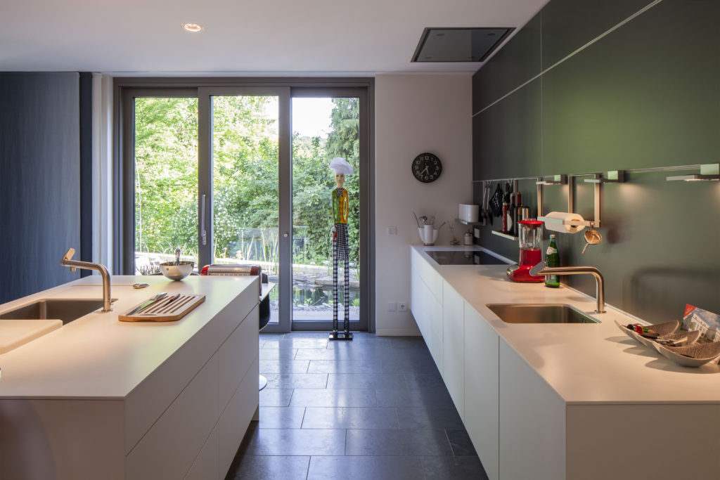 Wohnbereich im Erdgeschoss und private Räume im Obergeschoss sind über eine Galerie im Wohnraum mit zahlreichen Durchblicken verbunden. Im Souterrain befinden sich eine optionale Einliegerwohnung, ein Wellnessbereich, ein Billardraum, sowie Lager- und Technikbereiche.
