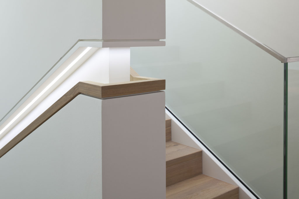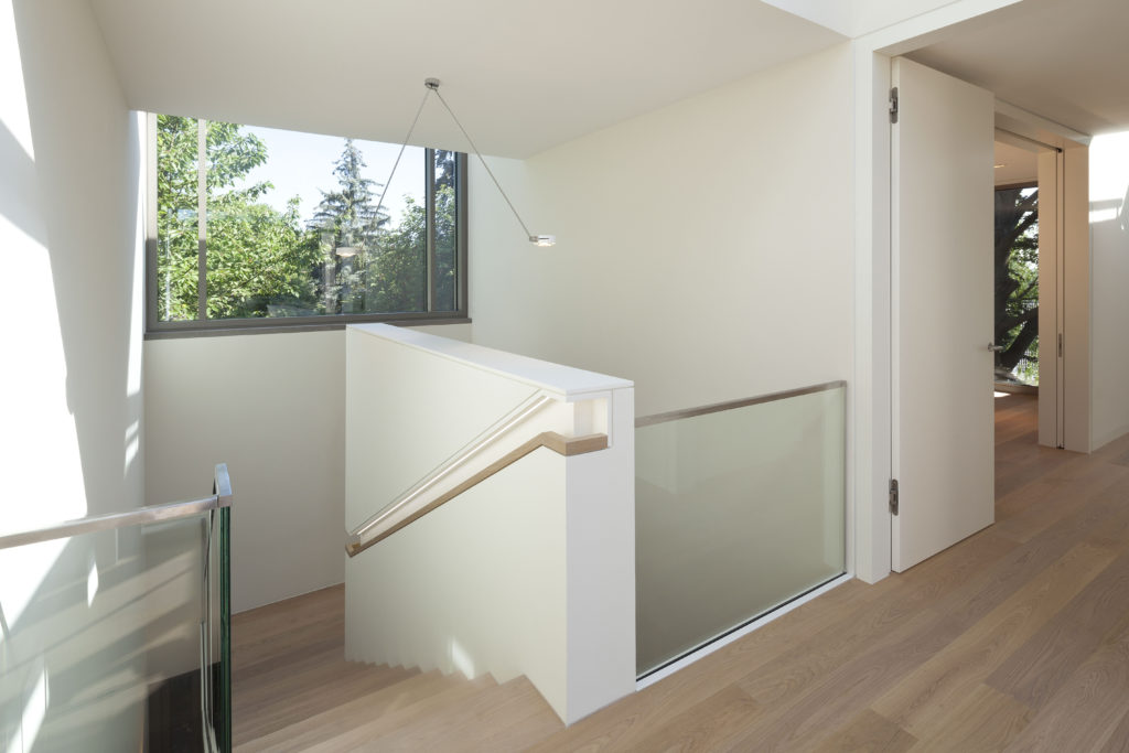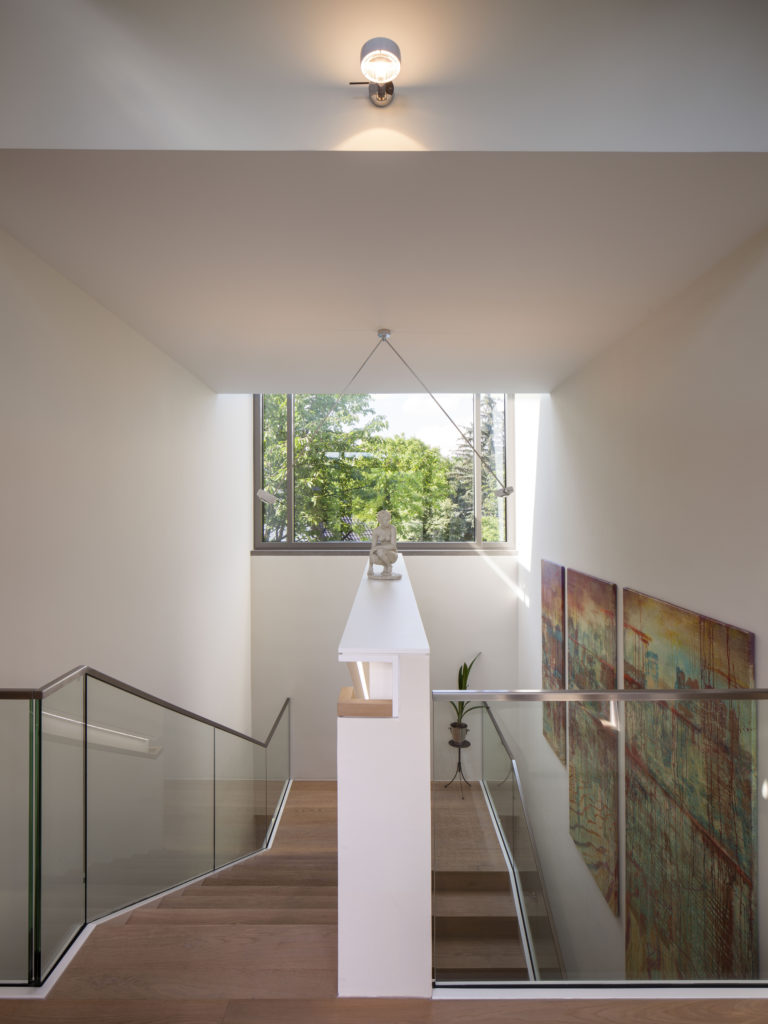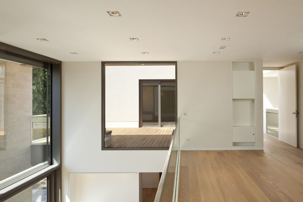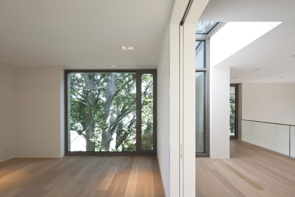 Die Komposition der Fensteröffnungen eröffnet ausgewählte Blickbezüge in die Landschaft, die im Wechselspiel von Offenheit und Geschlossenheit mit Wandflächen für ausgesuchte Möbelstücke und Bilder stehen. Verbindendes Element der Entwurfskomposition sind individuelle Einbaumöbel die thematisch die räumlichen Konzeptionen unterstützen.