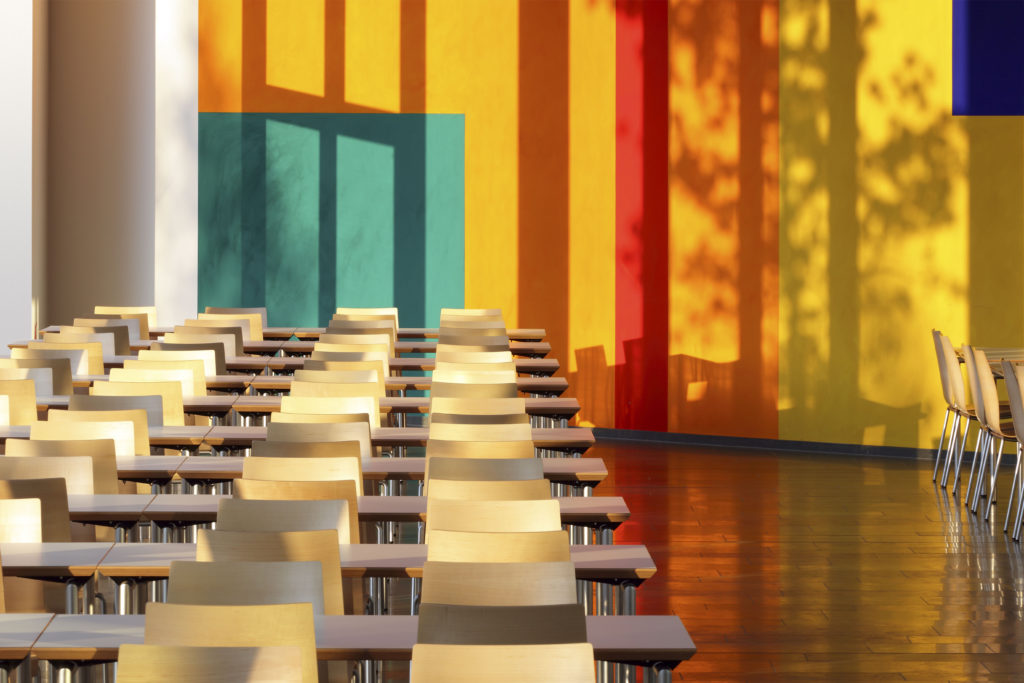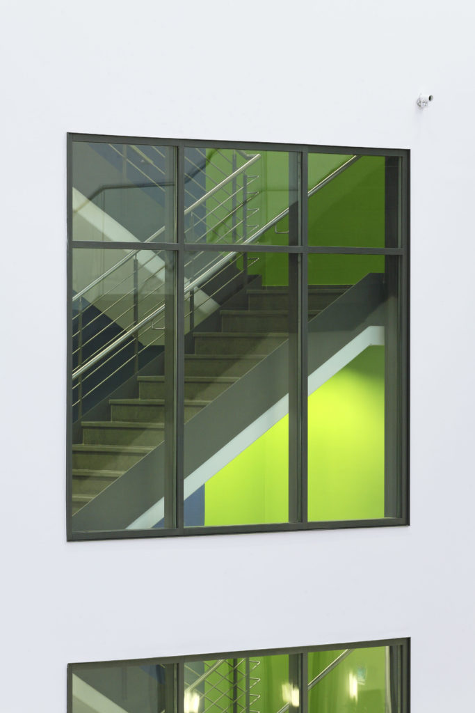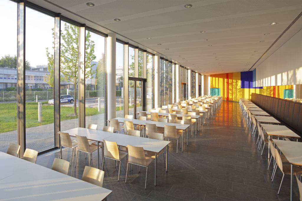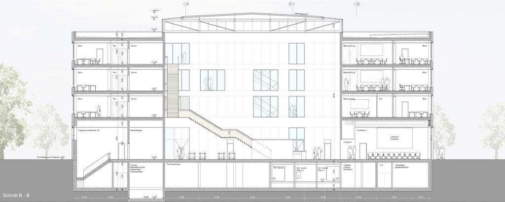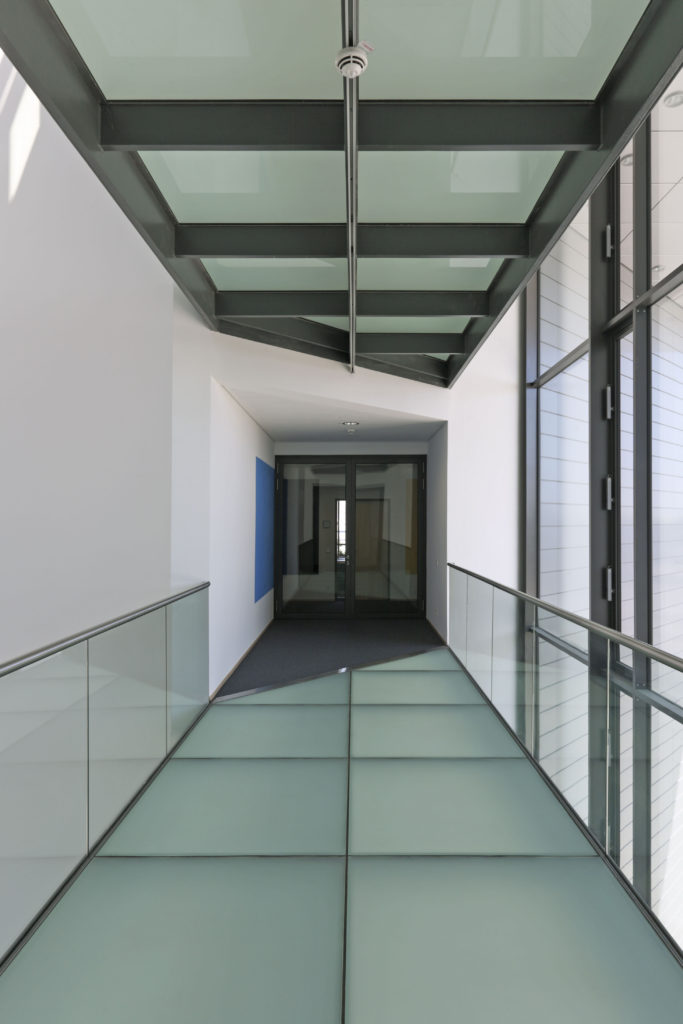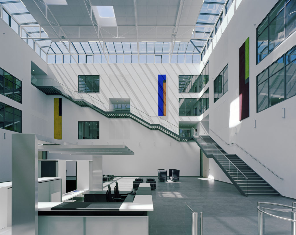 Die horizontale Gliederung der Fassaden aus Fenster- und Brüstungsbändern legt sich auf das geschosshoch verglaste Erdgeschoss. Der baukörper hohe Eingang gibt dabei den Blick in die zentrale Halle frei, die von einem filigranen Stahlfachwerk überspannt wird. Gezielt positionierte Lichtkuppeln und ein umlaufendes Lichtband schaffen stimmungsvolle Tageslichtverläufe.
