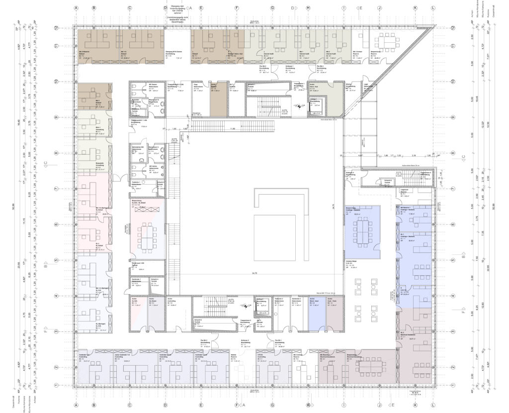 Um die Halle legt sich die Kernzone mit Treppenhäusern, Nebenräumen und den Besprechungsräumen, die spannende Blickbeziehungen in die Halle herstellen. Entlang der Aussenfassaden sind die Bürofläche nach unterschiedlichen Anforderungen aufgeteilt.