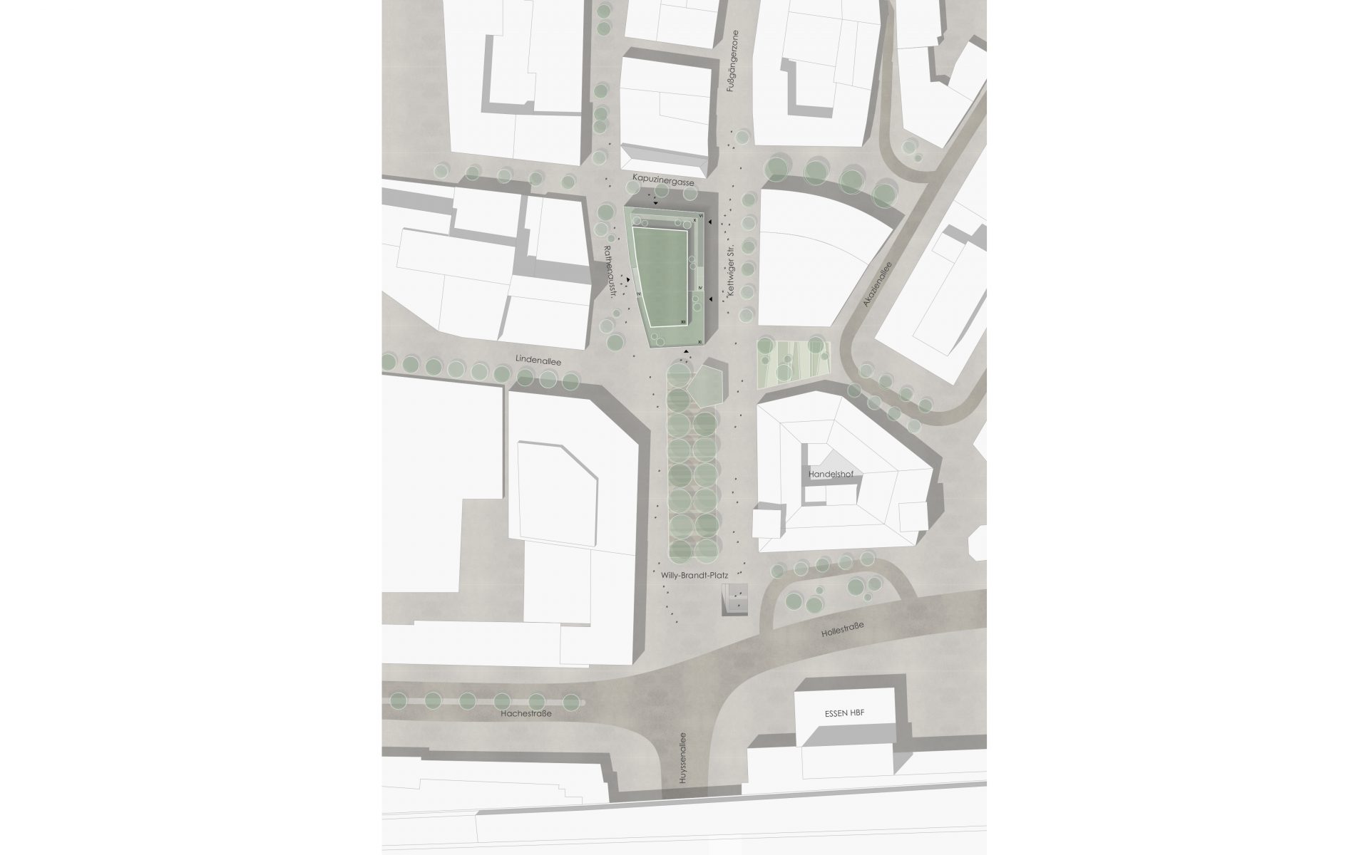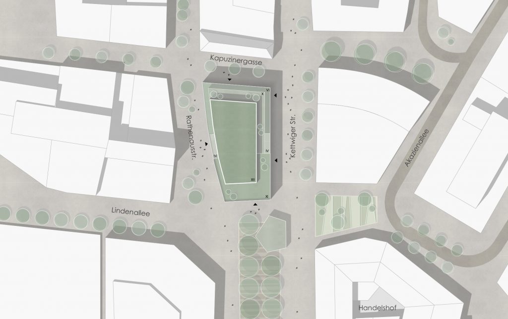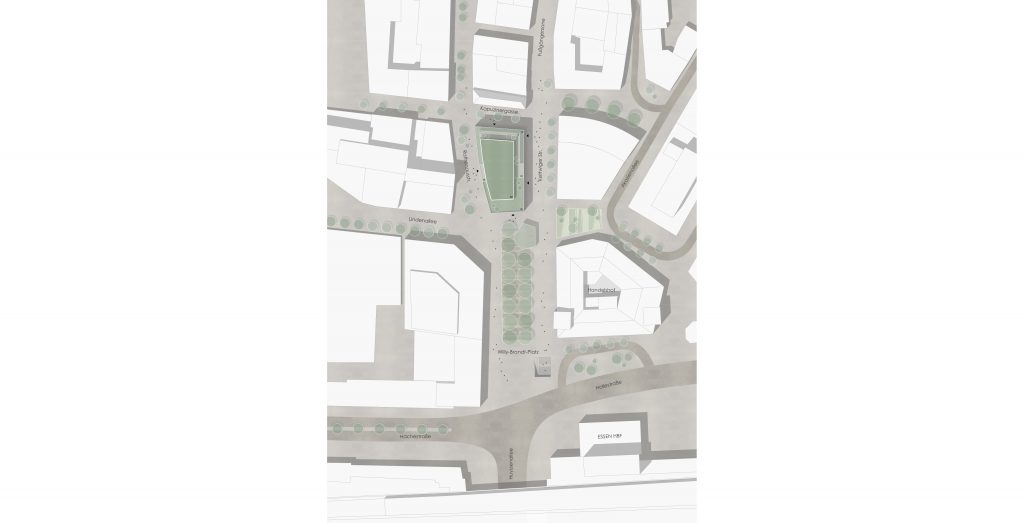 Der Willy-Brandt-Platz am Hauptbahnhof bildet das südliche Entree der Essener Innenstadt. Eingerahmt von Hauptpost und Handelshof soll das ́Neue Eickhaus ́ eine Ära der Essener Innenstadt im Zeichen vielfältiger Nutzungen und ökologischer Transformation einläuten. Der Kopfbau wird mit neuer gläserner Aufstockung prägend für die Wahrnehmung des Eingangs zur Innenstadt werden. Nach Norden staffelt sich das Gebäude mit Dachterrassen ab und bildet so den Übergang zur bestehenden Bebauung.