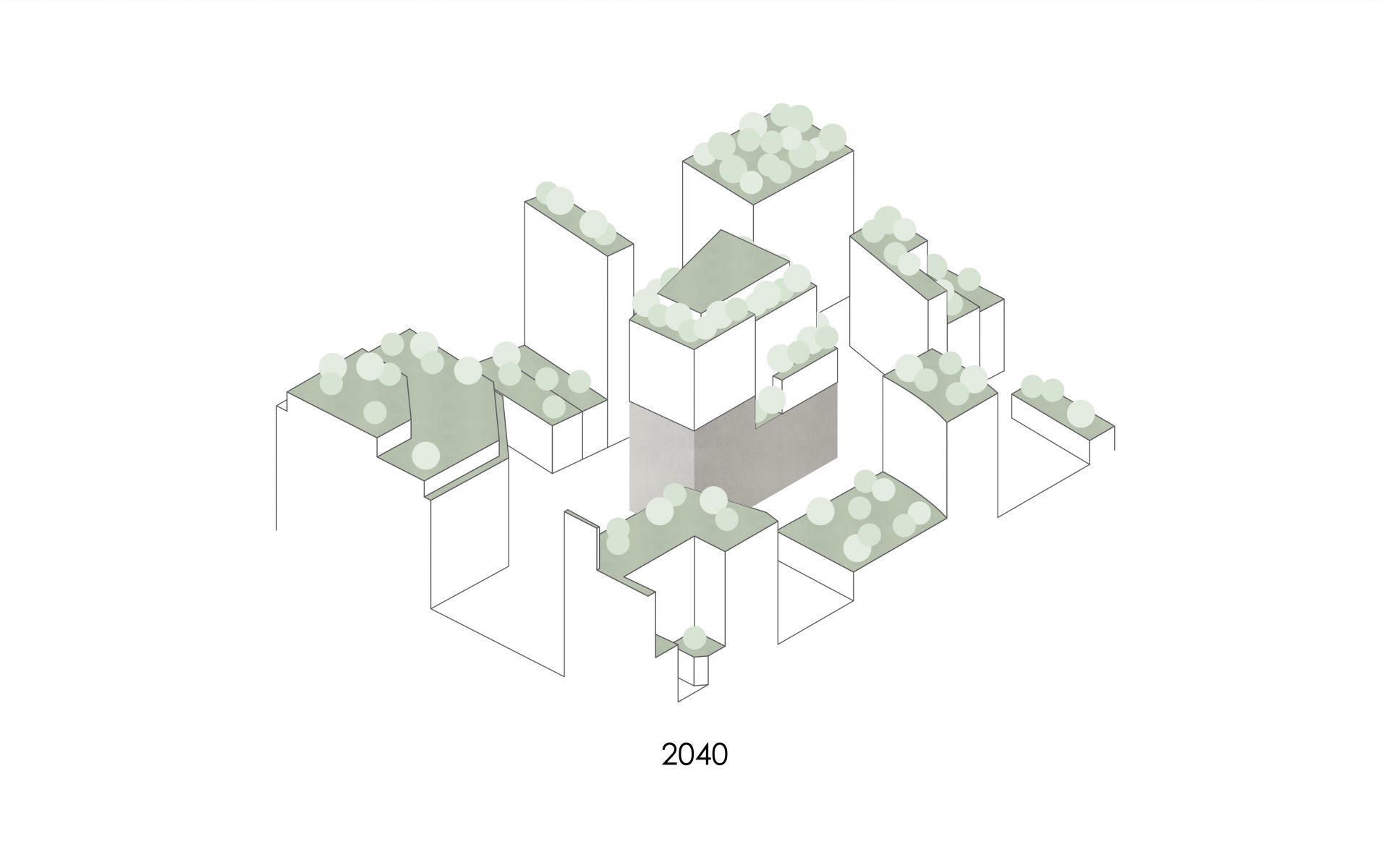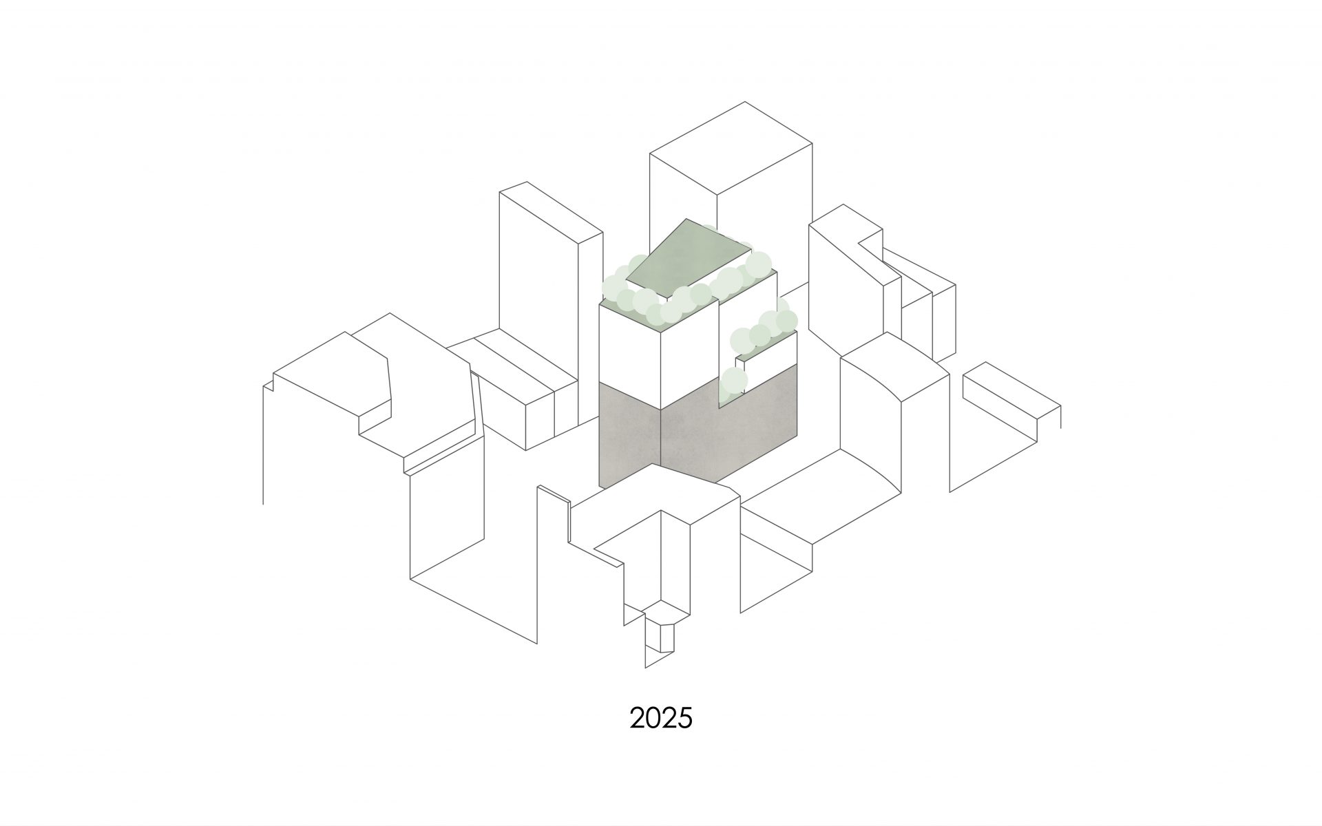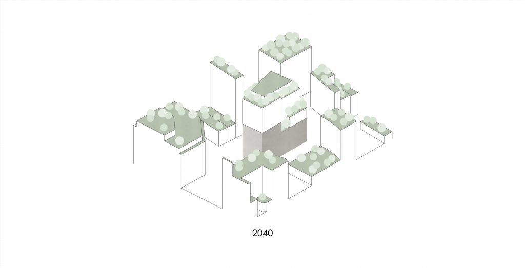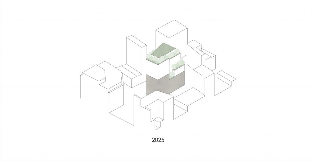 Gestaffelte Terrassen und Fassadenabschnitte mit üppiger Begrünung sind vom Stadtraum erlebbare Elemente der Aufstockung, die mit Low-Tech Konzeption einen wichtigen Impuls für eine lebenswerte Innenstadt setzt. Die Begrünung beeinflusst das Mikroklima am Gebäude positiv und schafft zugleich attraktive Austritte aus den Büroflächen. An geeigneten Stellen werden netzartige Rankhilfen vor den Fassaden installiert, die es erlauben, eine zusätzliche grüne Haut aus Pflanzen aufzuspannen. Besonderen Reiz bietet der windgeschützte große Dachgarten im obersten Geschoss.