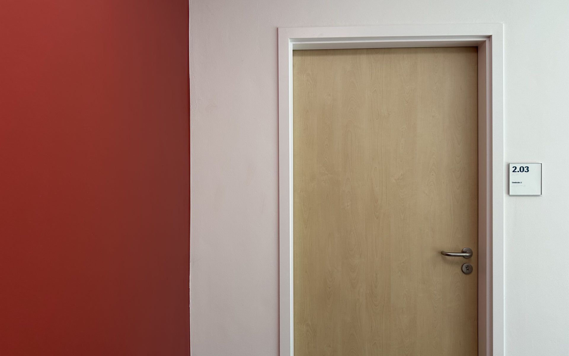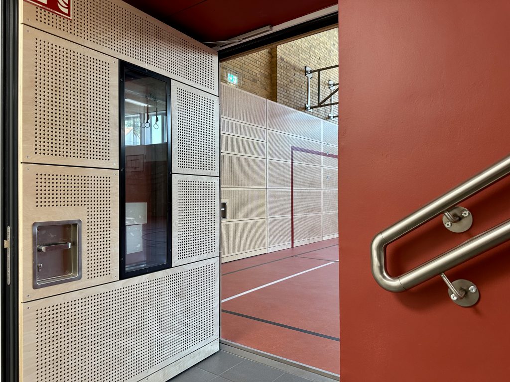 Im Innenraum wurde die Sporthalle mit einem zeitgemäßen Material- und Farbkonzept komplett erneuert, um eine angenehme Sportunterrichts-Atmosphäre herzustellen. Der alte Schwingboden wurde ausgetauscht und umlaufend eine neue Prallwand mit häzerner Oberfläche hergestellt. Die farbliche Gestaltung der Außenfassade setzt sich dabei im Inneren fort. Zudem wurde die Halle, sowie das ganze Gebäude, mit einer neuen Lüftungsanlage, neuer Beleuchtung, sowie Raumakustikelementen versehen.