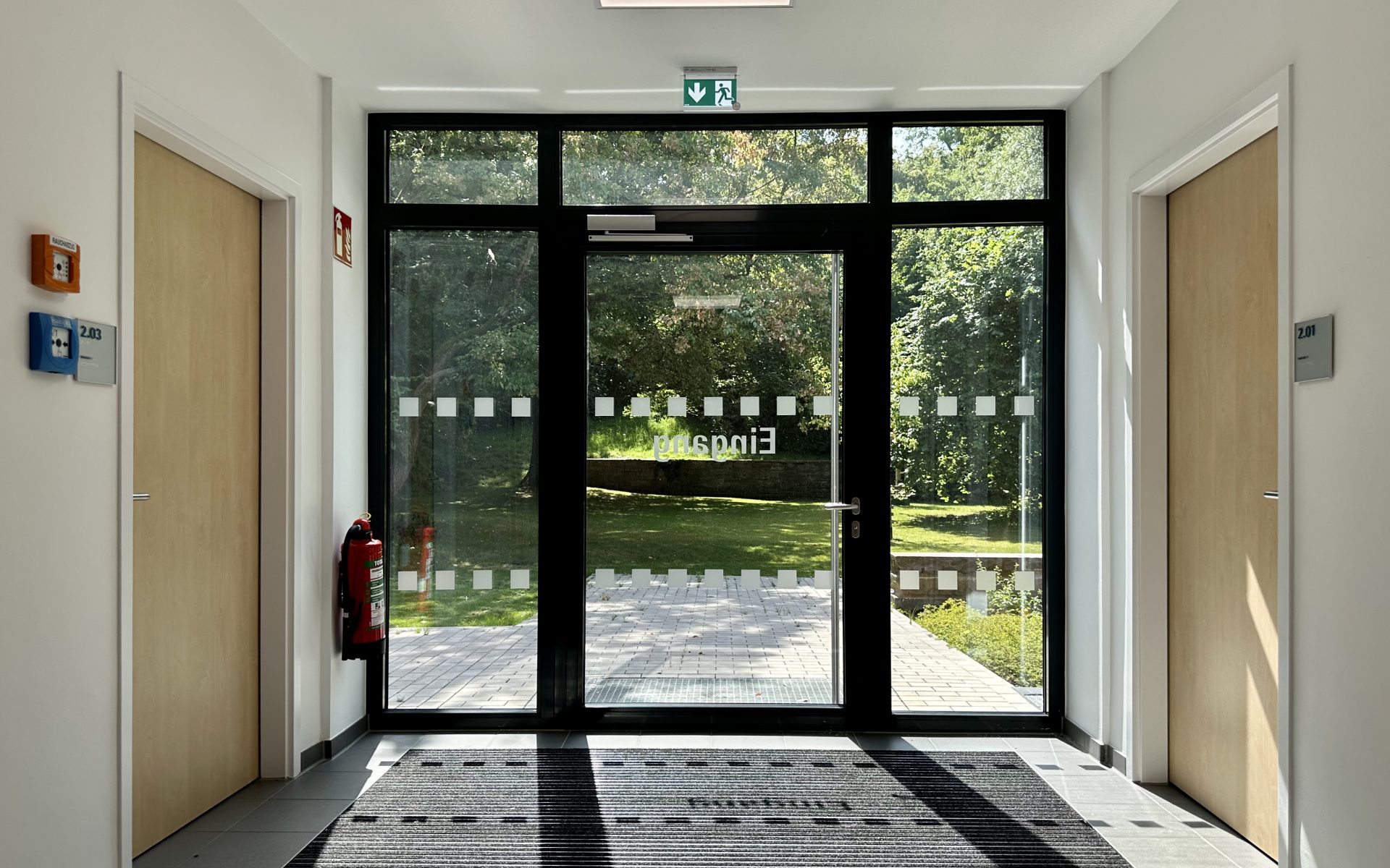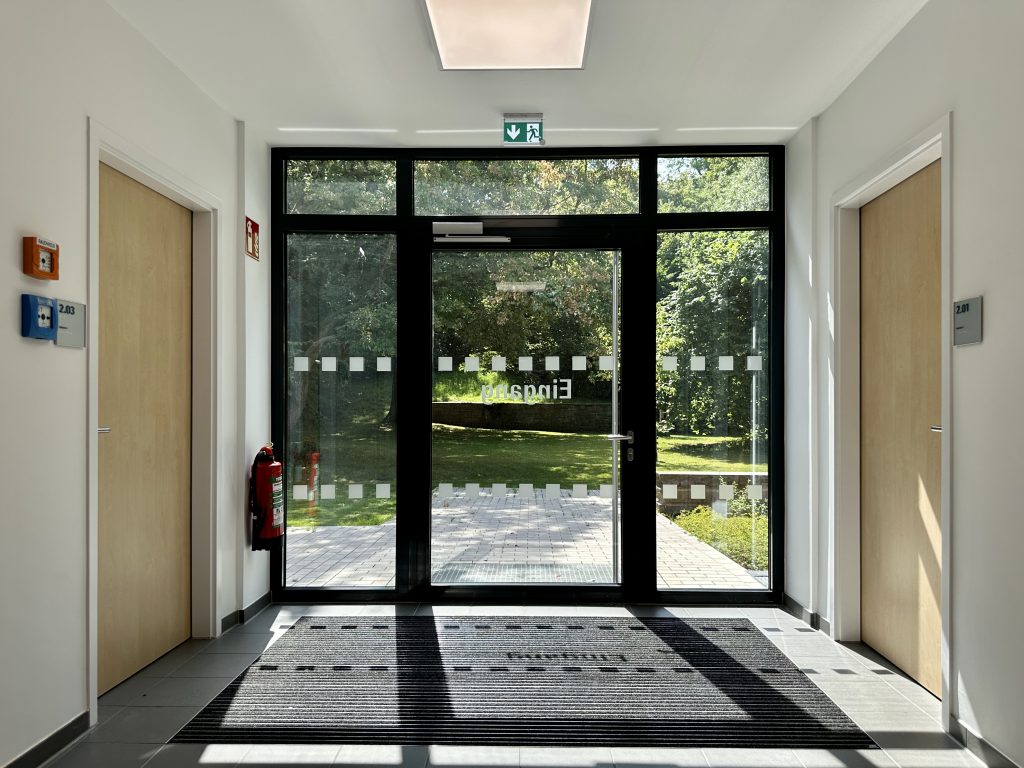 Der Außenbereich wurde neu gestaltet, in Form von Neubegrünung der Böschungen, Neubepflasterungen der Aufenthaltsbereiche vor dem Turnhalleneingang und der westlichen Schulhofseite.