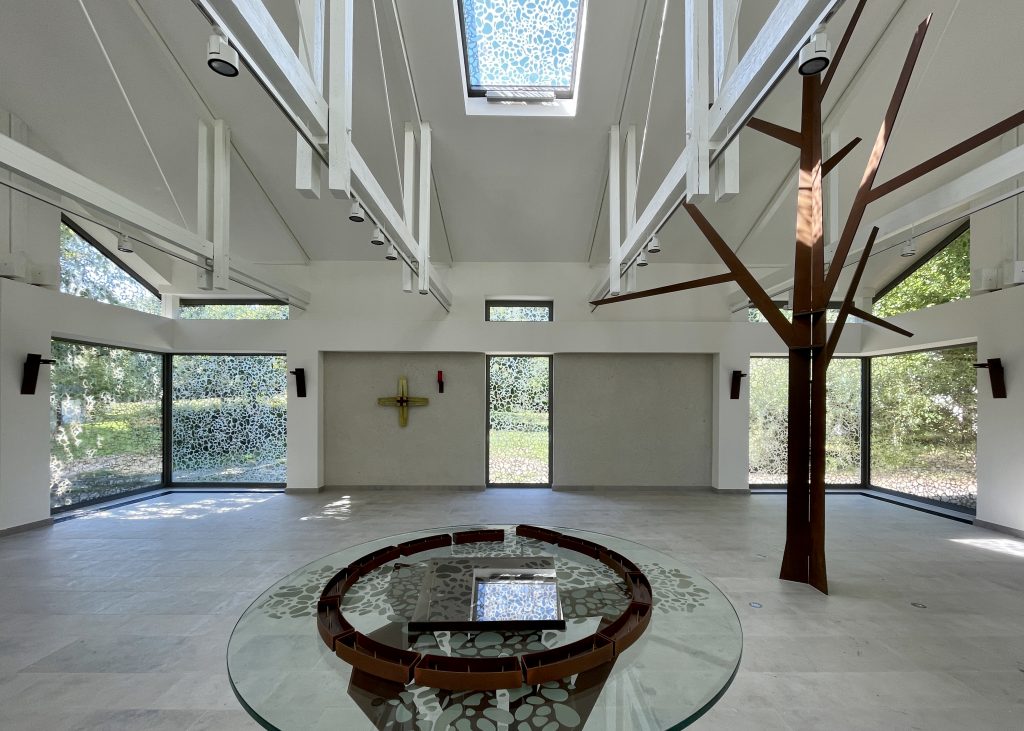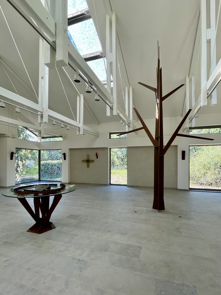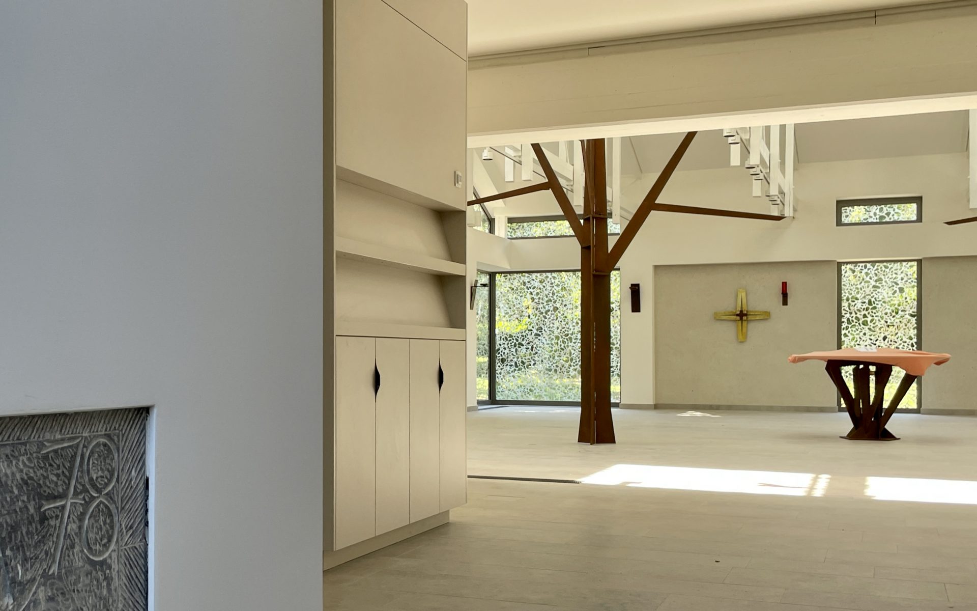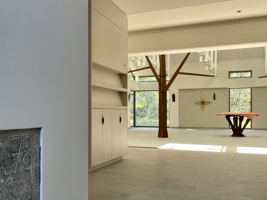 Der Altar steht nun zentral und ist von allen Seiten zugänglich. Zwei beleuchtete Baumskulpturen aus Cortenstahl flankieren ihn und verstärken die Raumwirkung. Dank der flexiblen Gestaltung lässt sich der Kirchenraum sowohl für Gottesdienste als auch für Musikveranstaltungen oder Seminare nutzen. Helle Farben, weiße Wände, neue Lichtquellen und erdige Naturtöne prägen das freundliche und zeitgemäße Innenbild.