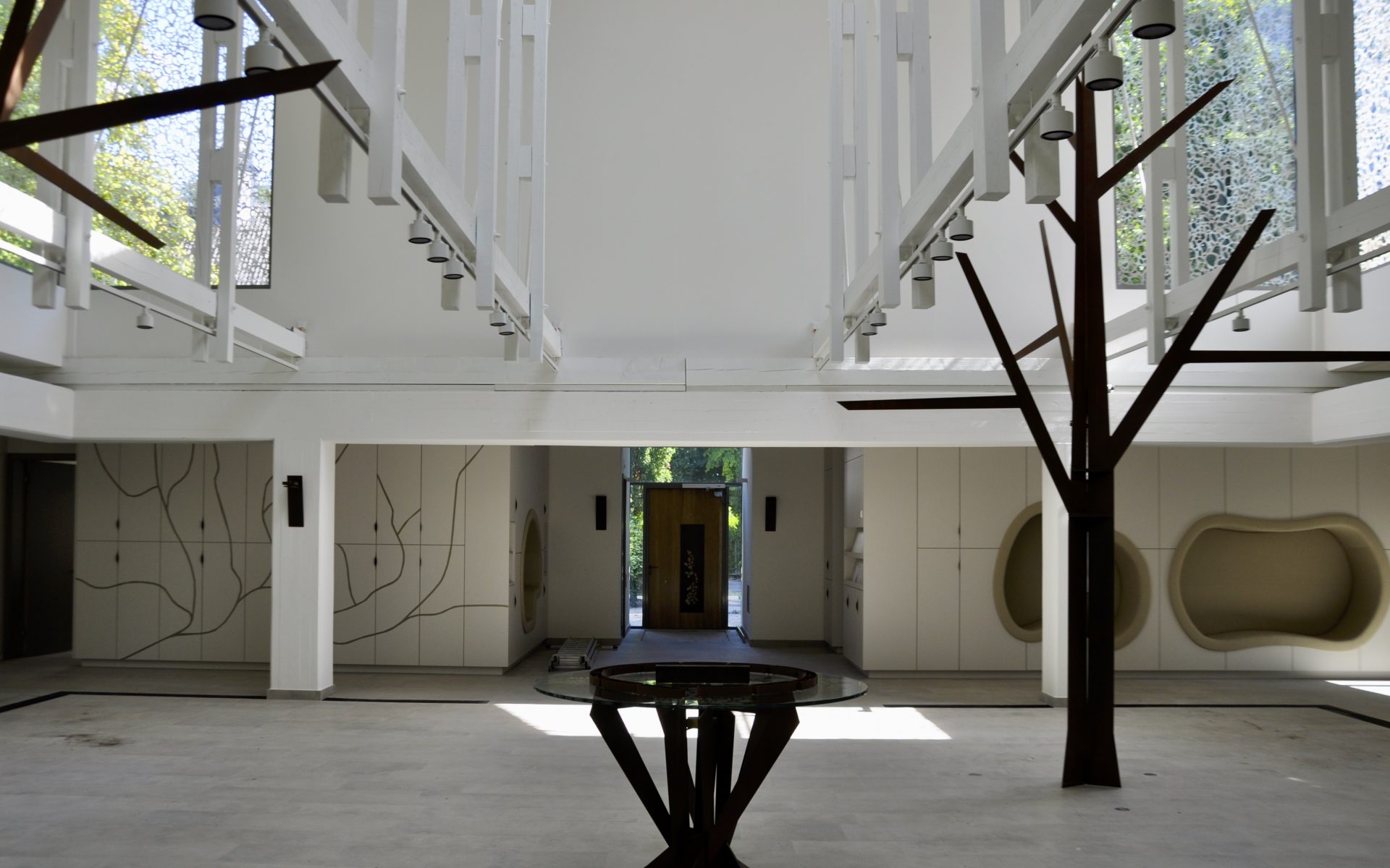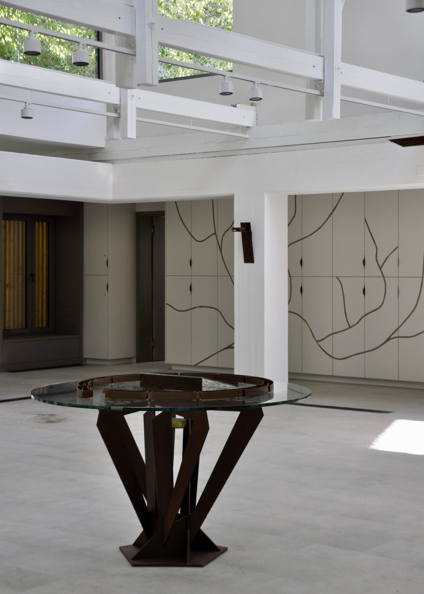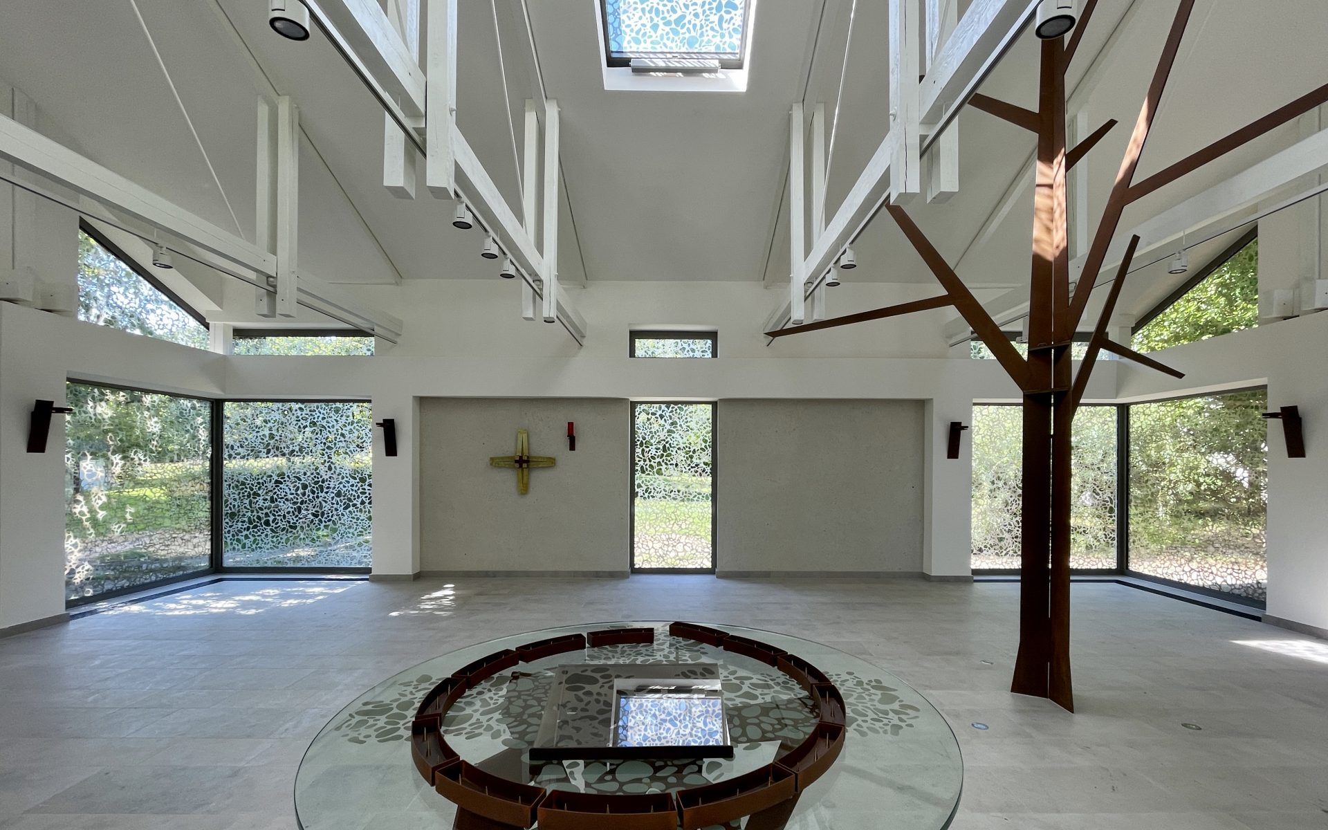 Der Altar steht nun zentral und ist von allen Seiten zugänglich. Zwei beleuchtete Baumskulpturen aus Cortenstahl flankieren ihn und verstärken die Raumwirkung. Dank der flexiblen Gestaltung lässt sich der Kirchenraum sowohl für Gottesdienste als auch für Musikveranstaltungen oder Seminare nutzen. Helle Farben, weiße Wände, neue Lichtquellen und erdige Naturtöne prägen das freundliche und zeitgemäße Innenbild.