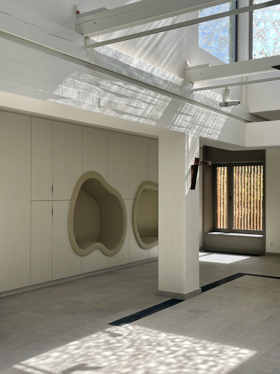 In enger Zusammenarbeit von Planern und Nutzern wurde ein architektonisches Gesamtkonzept entwickelt, das pädagogische und liturgische Anforderungen miteinander verbindet. Dabei wurde das bestehende Raumprogramm behutsam weitergeführt. Der neu geöffnete Eingangsbereich erhält Licht vom Vorplatz und führt in ein kleines Foyer. Von hier aus gelangt man links in einen Gruppenraum und rechts in die Sakristei, beide durch neue Oberlichter erhellt.